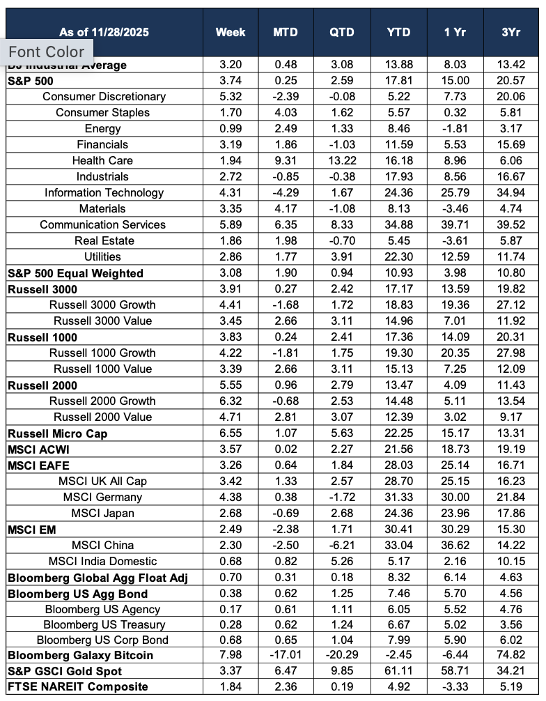 US markets had an abbreviated trading week due to the Thanksgiving holiday. The S&P 500 advanced 3.74% recovering from the previous week’s decline. The benchmark is up 13.56% year-to-date. Developed markets advanced, and the MSCI rose 3.26%. On a year-to-date basis, the developed benchmark is up 28.03%.