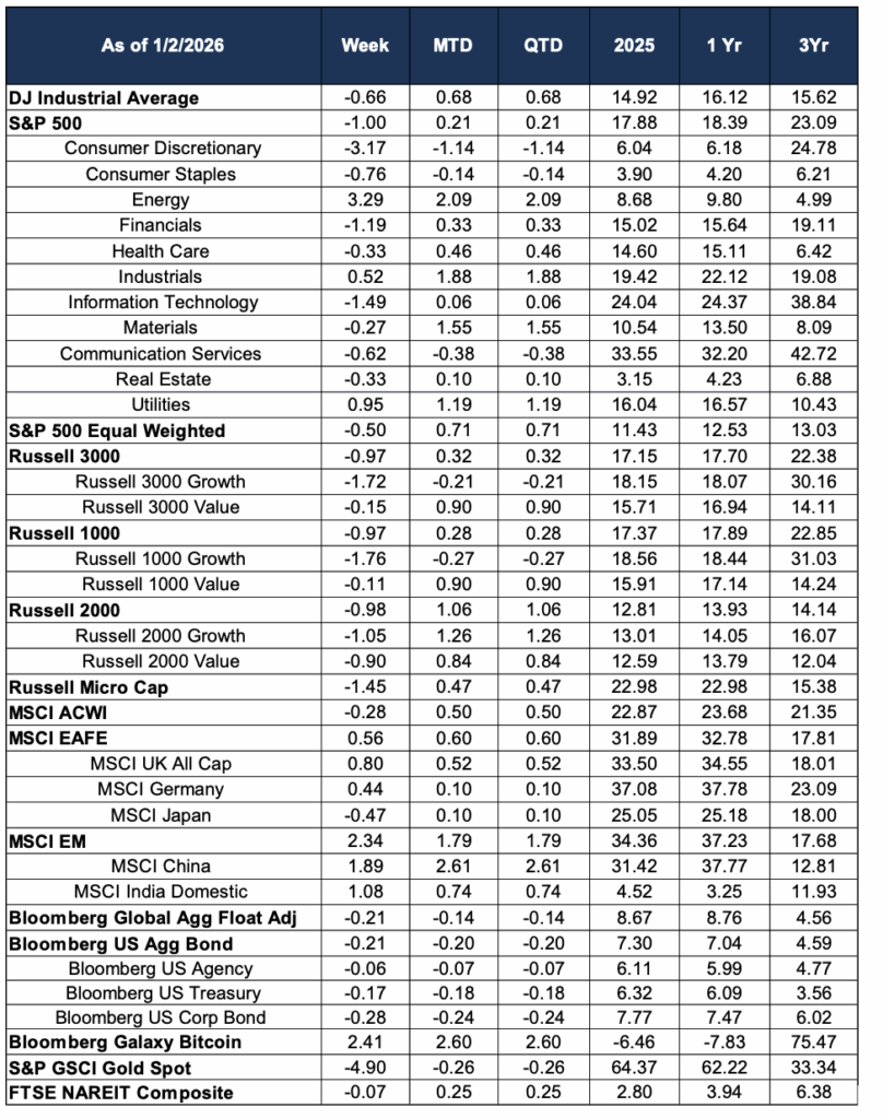 Weekly Market Commentary – January 5, 2025January 5, 2026January 5, 2026 | Weekly Market Commentary Trading was light during the holiday week as we came into 2026. Source: Morningstar