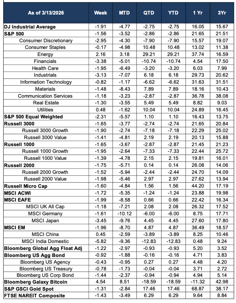Global equity markets extended their retreat during the week ending March 13, 2026, with virtually all major indices posting losses amid continued macro uncertainty. The Dow Jones Industrial Average declined 1.91% on the week, bringing its month-to-date loss to 4.77%, while the S&P 500 fell 1.56%, pulling its year-to-date return to -2.86%. The selling pressure was broad-based but uneven, with cyclical and growth-oriented sectors bearing the brunt of the decline. Defensively positioned assets—most notably energy commodities and gold—continued to serve as relative safe havens, underscoring a risk-off tone that has characterized trading through the first quarter.