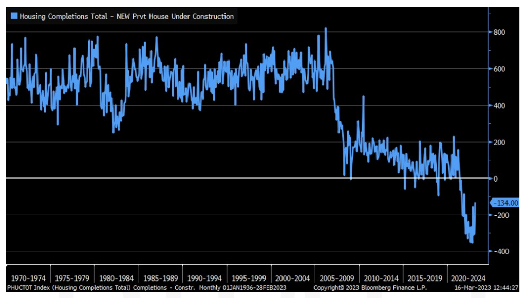 According to a new report from Redfin, median US Home sale prices fell 1.2% in February from a year ago. This is the first year over year decline in home prices since 2012. The number of homes sold is down 22.8% year over year. While still in negative territory, the number of units completed versus the number of units under construction has rebounded from over an 300K deficit to 134K deficit.
