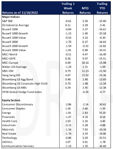 The 2-year Treasury Yield climbed throughout the week to 4.51%, up 11 bps from Monday. The 10 and 30-year Treasury Yields fell, finishing the week at 3.82% and 3.92%. Although recent data has suggested that inflation is beginning to cool, the Fed has maintained a hard line on inflation stating that they will continue hiking rates until they are sure that inflation has peaked. Consensus believes there will be a 50-bps hike during the December 14th meeting which comes one day after the publishing of Novembers CPI data.