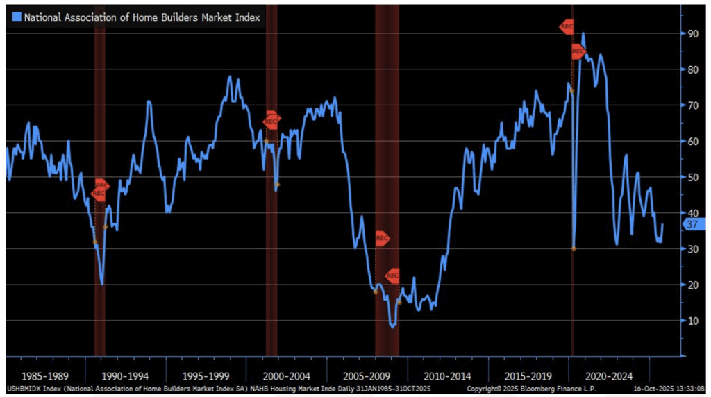 Economic data was thinner than usual amid the ongoing federal shutdown, but a few notable readings still landed. Homebuilder sentiment (NAHB HMI) surprised to the upside at 37 (forecast 33, previous 32) on Oct 16.
