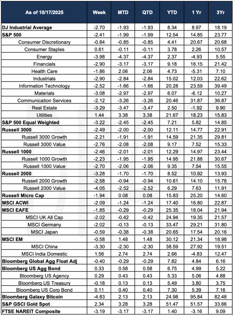 U.S. and global stocks finished higher for the week as worries over regional banks eased and trade rhetoric softened into Friday. The S&P 500 gained +1.71% week‑over‑week, the MSCI ACWI rose +1.21%, and the Bloomberg U.S. Aggregate, advanced +0.45%. Headlines credited Friday strength to President Trump saying 100% tariffs on China would be “not sustainable,” alongside steadier bank earnings, helping all three major U.S. indexes notch weekly gains.