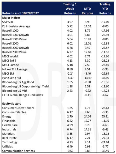 On Wednesday, November 2nd, we’ll get a flurry of countries reporting on production progress but those data points will likely take a back seat to the US Fed’s rate decision but, more importantly, language from Chairman Powell around future guidance. Much of the advance this past week in the equity markets was due to speculation that the Fed may pause after Wednesday’s increase which is largely expected to be 75 basis points.