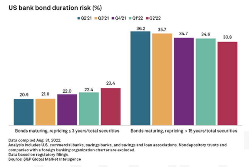 Banks have slowed on bond purchases due to a decline in Q2 deposits. Banks have continued to allocate less cash to the long end of the yield curve due to the liabilities these investments face when rates rise. Bonds set to expire in 15 years or more have seen a drop off in allocation, down 33.8% of bank held securities from 36.2% in the same quarter a year ago.